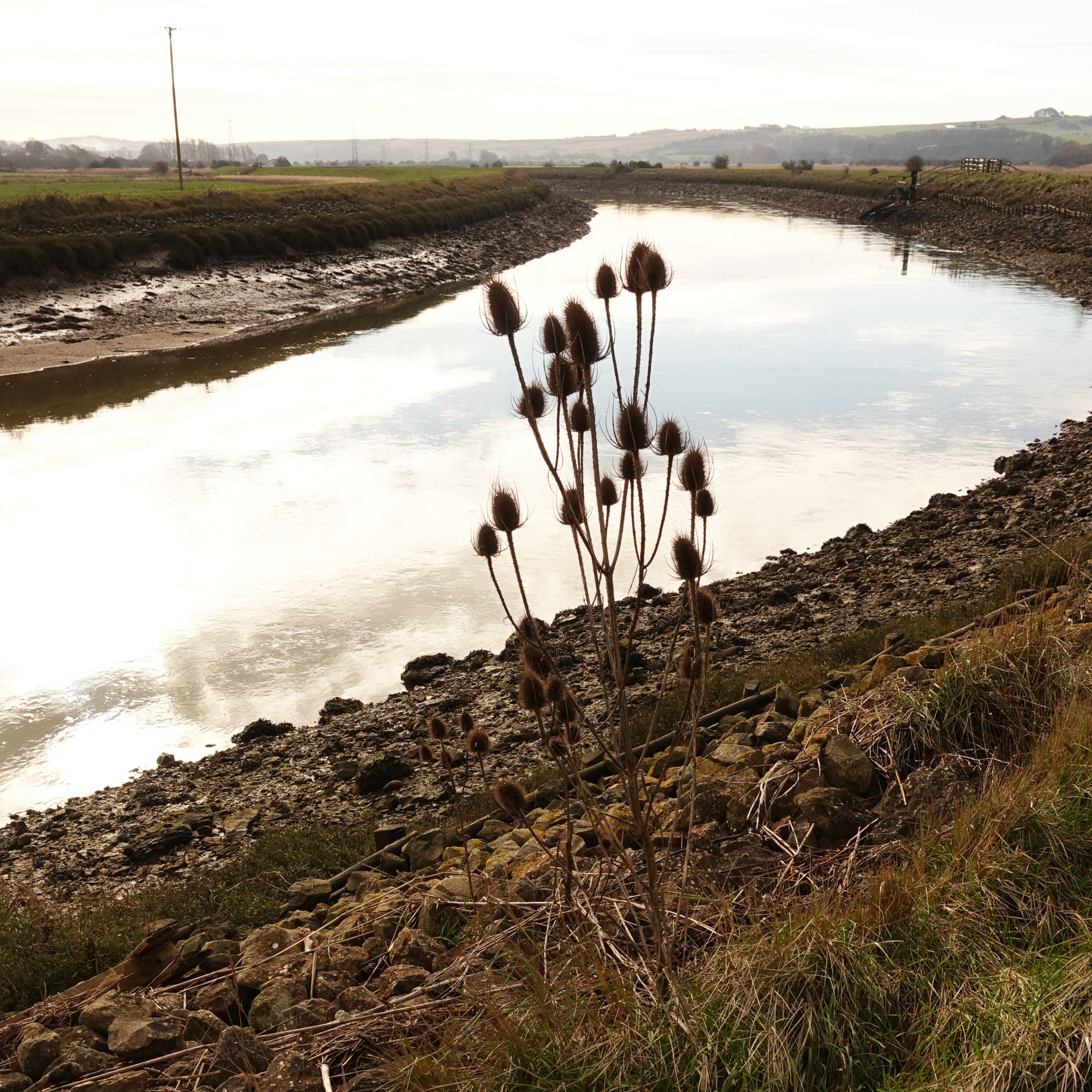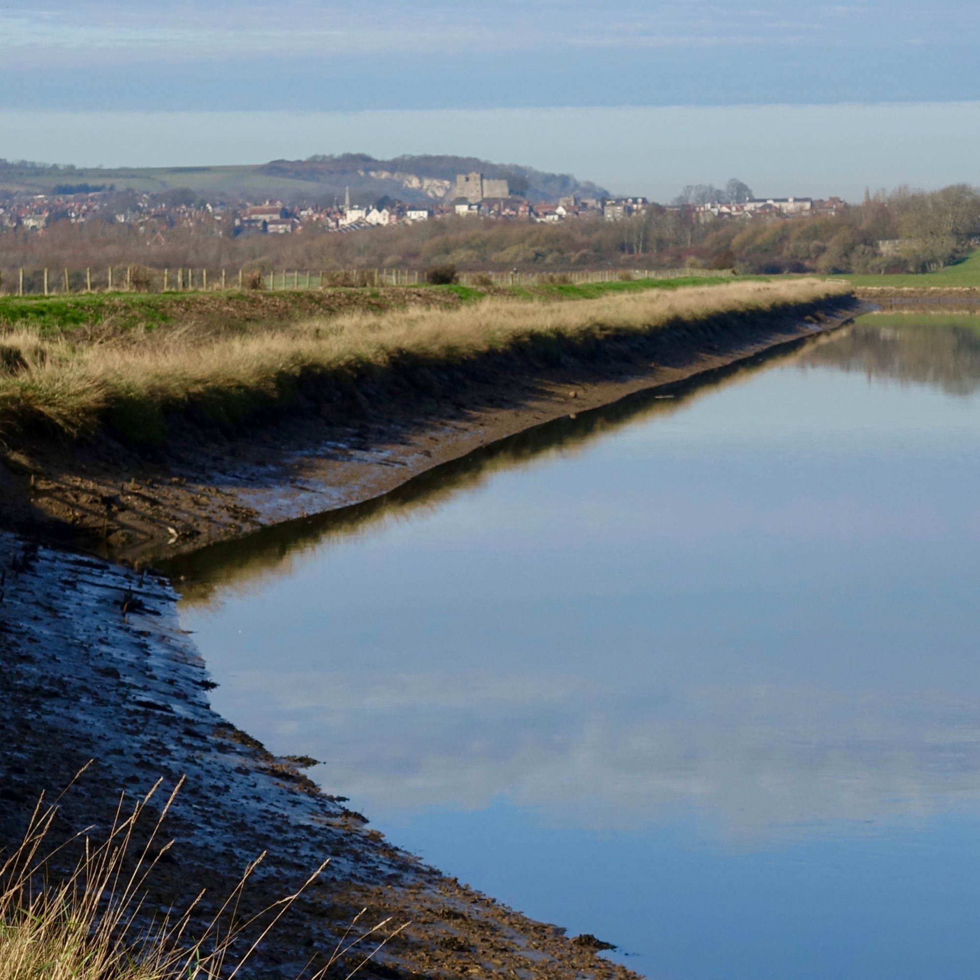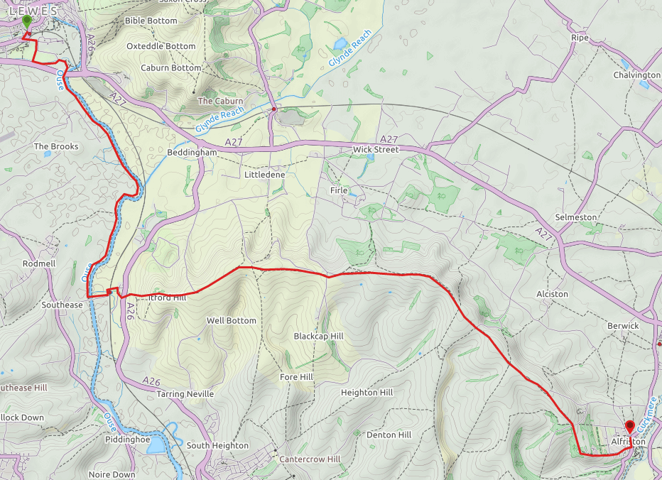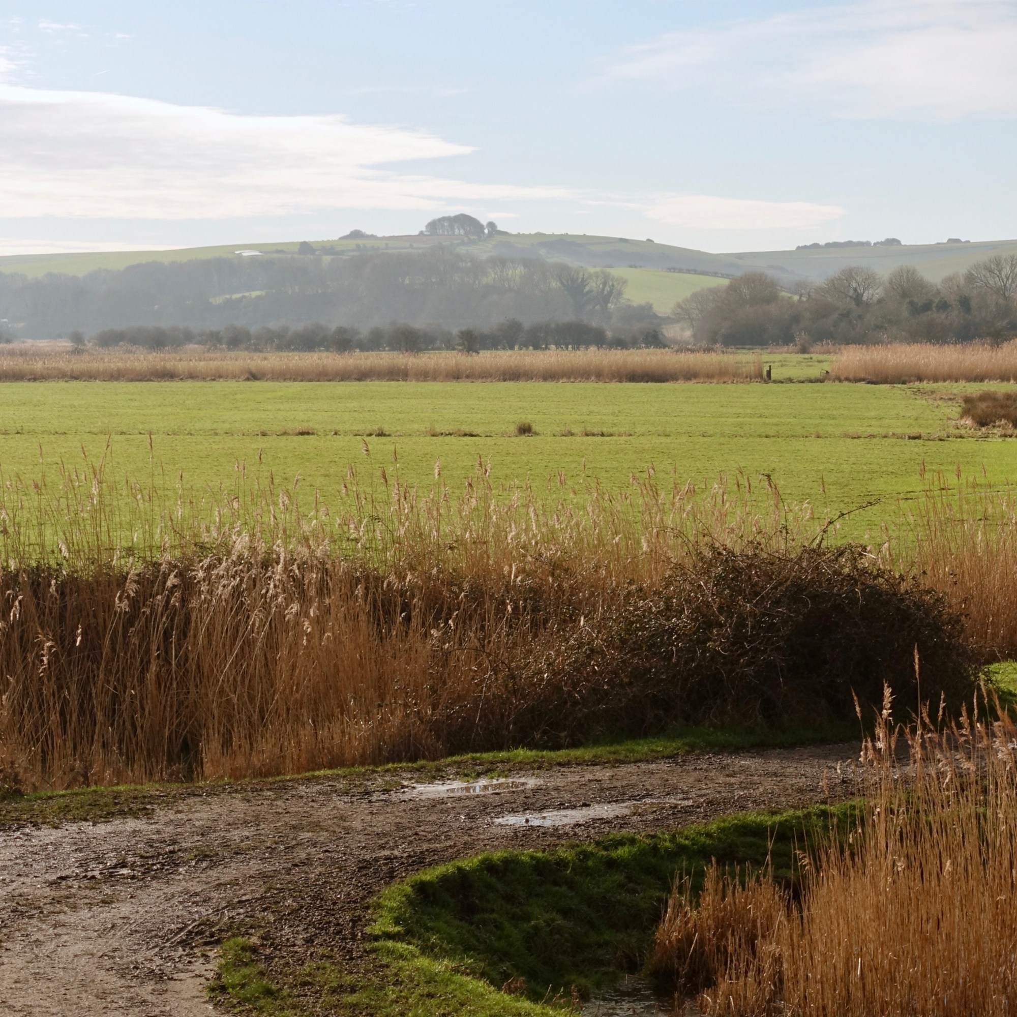The first fine week of 2020 and I was keen to get out and enjoy some sun on a cold and frosty morning so decided to get out of London and revisit an 11 mile walk from Lewes in East Sussex to Alfriston. From Victoria Station, Lewes is just an hour away by train and added to that 20 mins on the Overground and I could be there by mid-morning. I use Trainline for tickets and, with a discount card could get there and back for £14. A bargain. A quick loo stop at Lewes station and packed lunch bought at the excellent cafe on platform 2 and I was on my way. The walk (map below). Come out of the upper part of the station and turn left towards the ruined Lewes Priory adjacent some playing fields. Cross diagonally to the right across these (or take an alternative route past the college to the left) go through a small gate and over a bridge that crosses a small river, turn left onto a metalled road which winds past a couple of houses and round the local recycling depot and ultimately under a large road bridge and finally onto the banks of the River Ouse, a large, navigable, tidal river which meanders its way S to Newhaven on the coast. The river does flood and there are levees on each bank which can be used as your path if the river is high. Given this was January after a wet, wet Winter the path was claggy in parts but frustratingly slow to begin with, the path narrow and occasionally very muddy. Thankfully it does improve after a mile or so, the path becoming wider and drier. The expansive scenery also improves – A mix of road, rail and river and some attractive pylons but beyond these the beautiful inviting downs to to the E and W. There is interesting birdlife – seashore dipper types, Swans, Starlings, Egrets and various reed loving little birds.