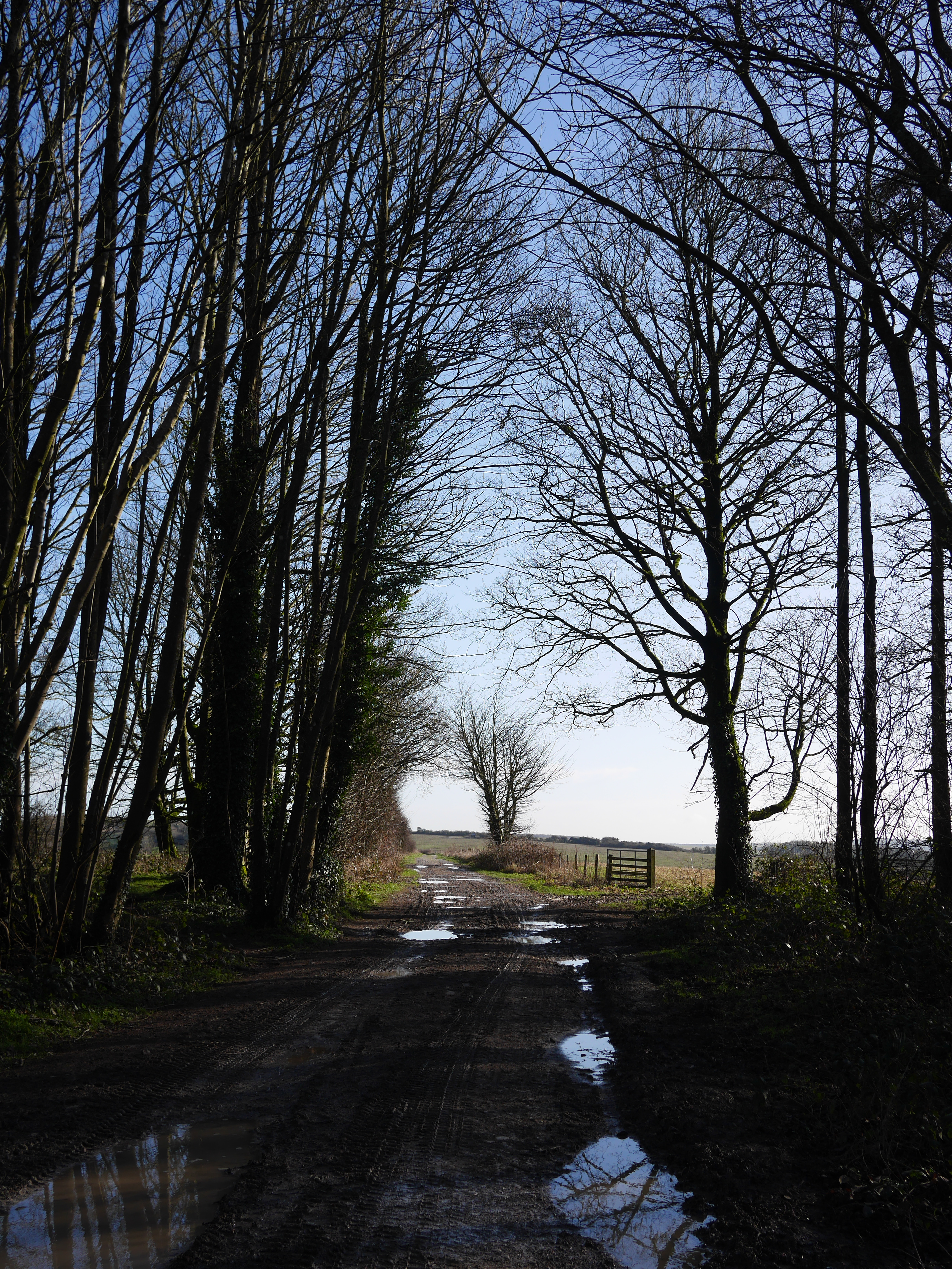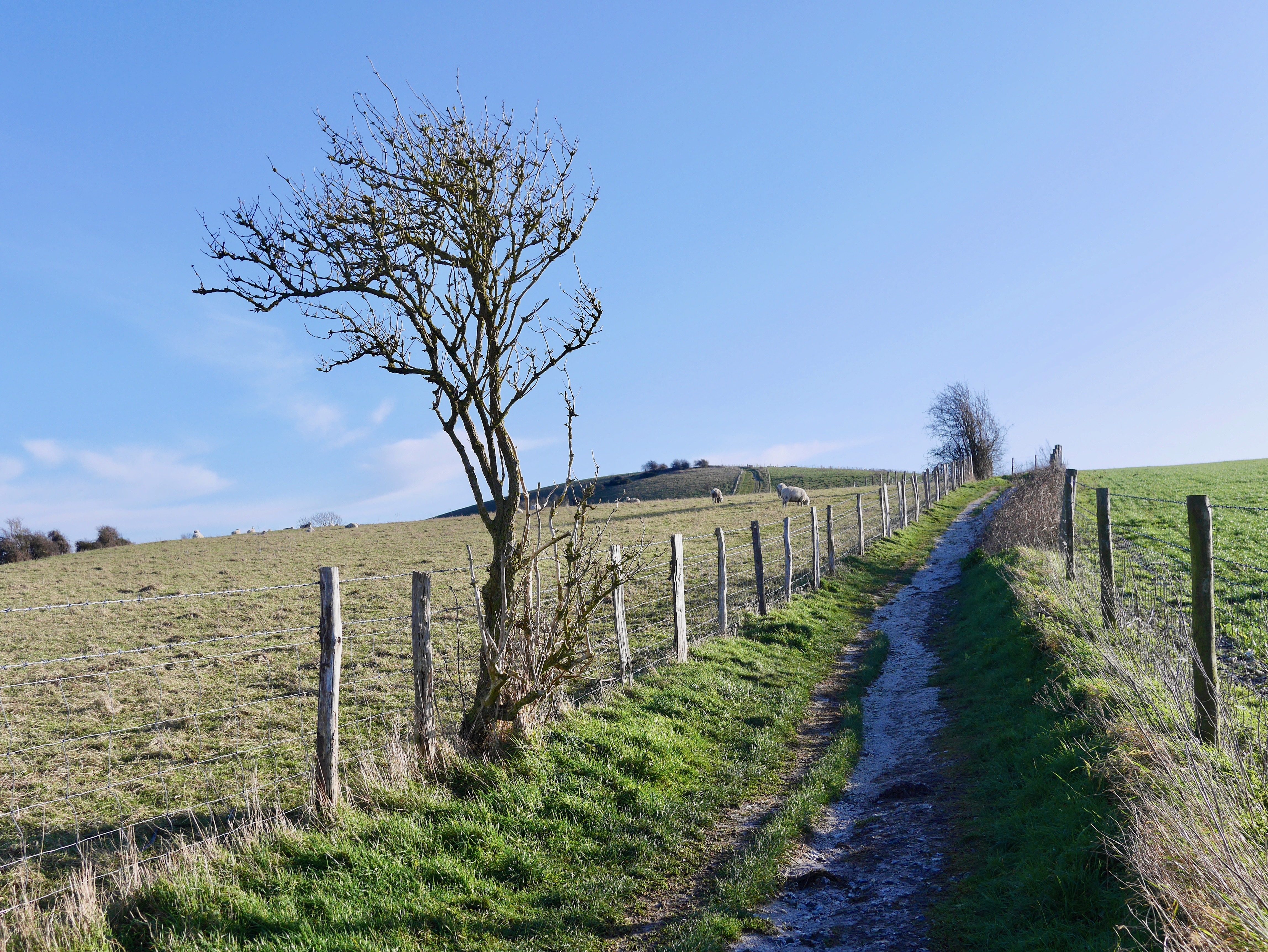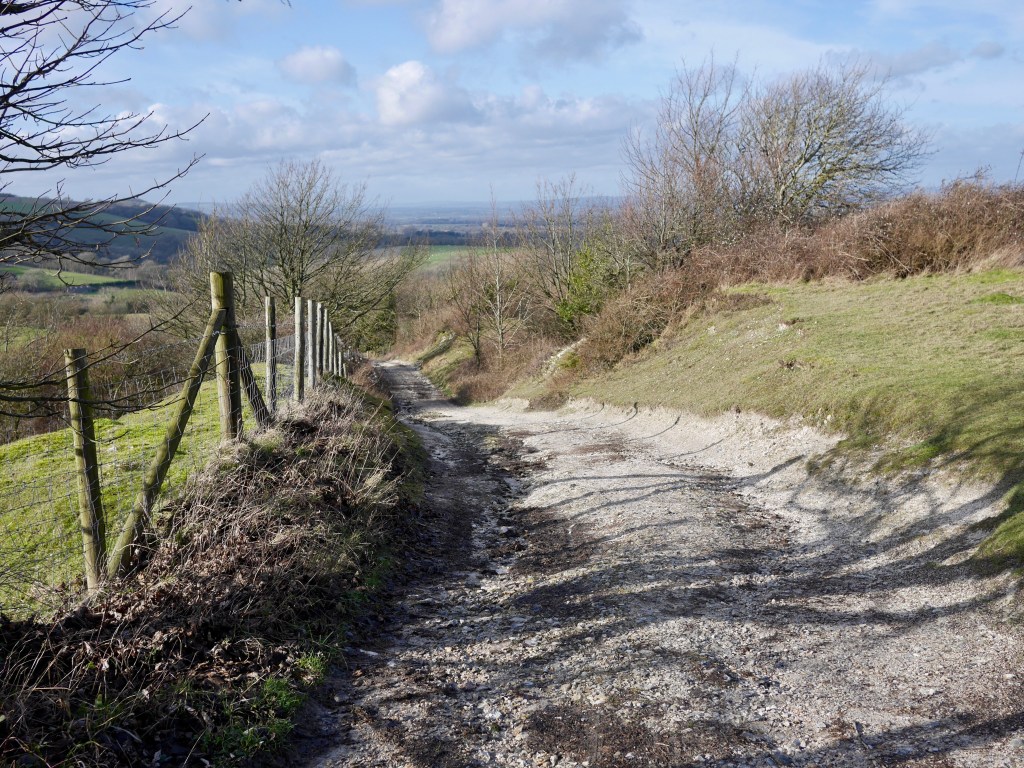 The forecast was for 5c with a cold SW wind and no rain. Perfect! The direct train from London takes just over an hour and a quarter. The walk (map below) starts by exiting the station and walking N up a busy road for a few hundred yards before turning E up a lane called ‘High Titten’. This is metalled for about a mile before the SDW takes a left and turns into a steep chalk and flint footpath. This path opens up (pic below) as it climbs between chalk grassland and I heard my first Skylark, for me the icon of the Downs. Being January and being wet chalk the path can be muddy and slippery and the path is restricted between fences (though there is a drier field to the left as an alternative, parallel path with stiles at each end – which I realised too late). The path runs past Rackham Hill (633 ft – 193m) before continuing through a spinney then between more fences and ploughed fields for another few miles.