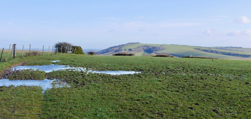 By Kithurst Hill the path opens up a little and is more more grassland and thorn and gorse as margins to the wider path. In a small area of heath I saw a pair of Stonechats and more Skylarks. The going is easy past the car park at the Chantry Post then uphill to wide open views. The path continues through farmland – a quagmire in places after the Winter’s rain, to Barnsfarm Hill, from which you can see ‘Black Down’, the highest point in the SD National Park some 13 m to the NW. It also offers a first glimpse of Chanctonbury Ring (pic below). The path descends towards a wood above the A24. The path turns into a lane (the signpost suggests going down a steep hill to the left to the N but I chose to stick to the metalled road (Glaseby Lane) given the conditions underfoot). There is also a welcome public water point on the lane opposite a few houses as you near the slip road to the A24.