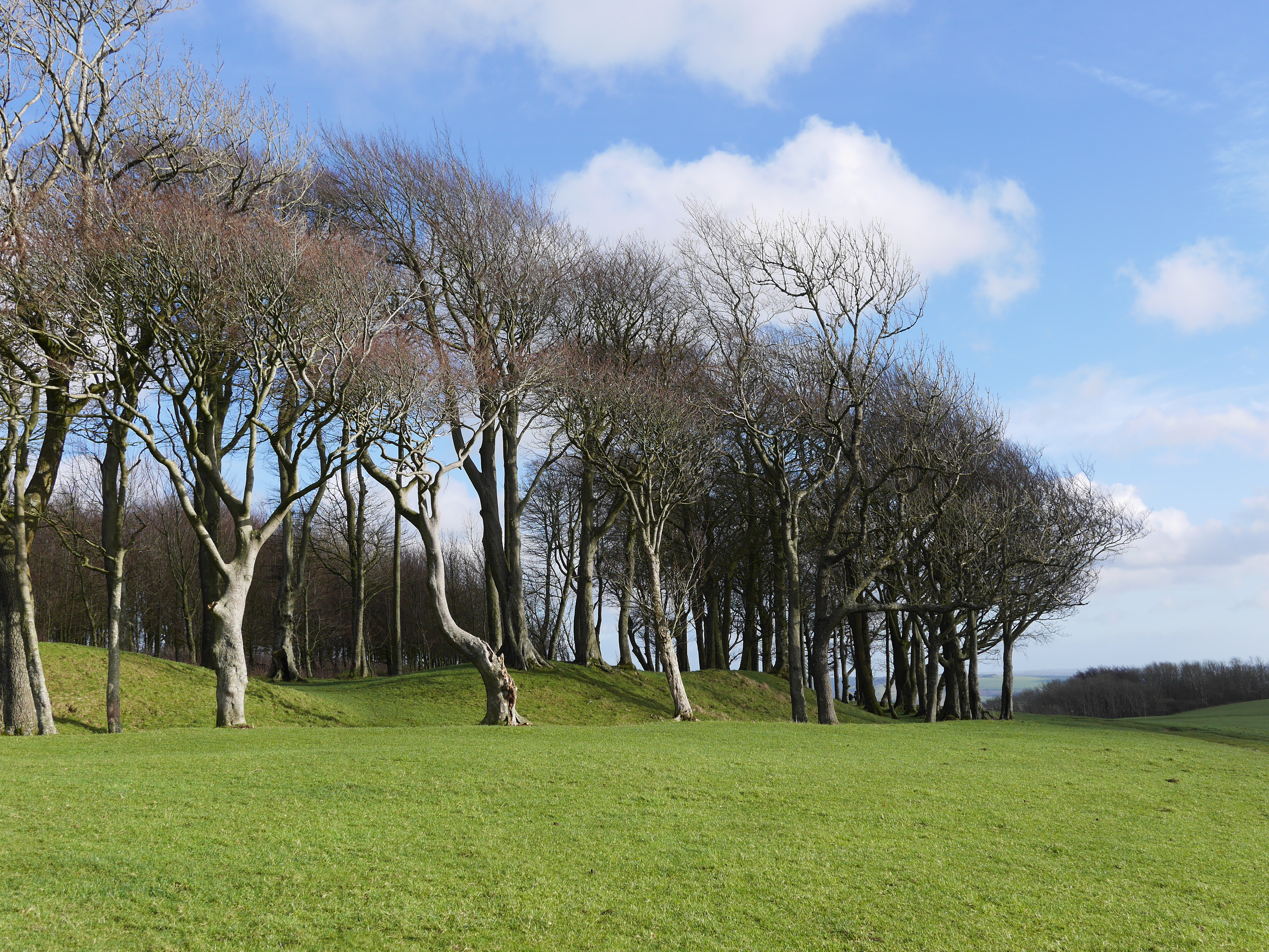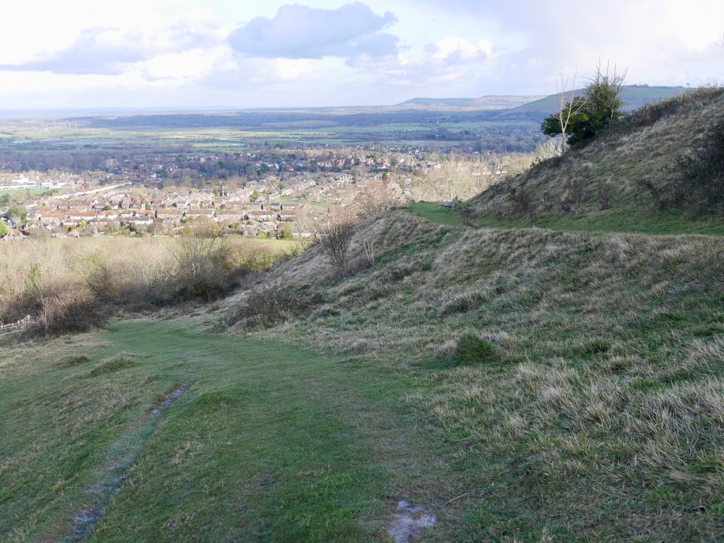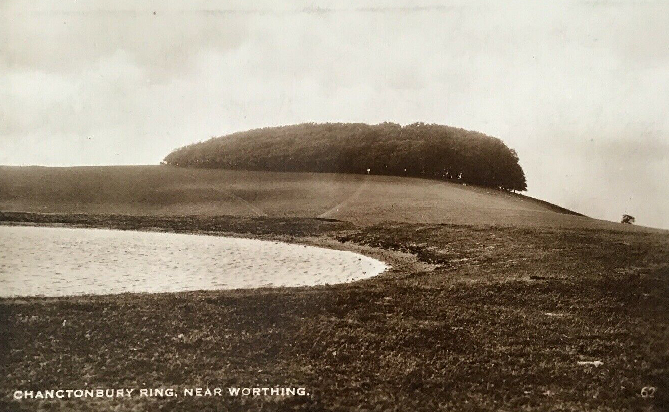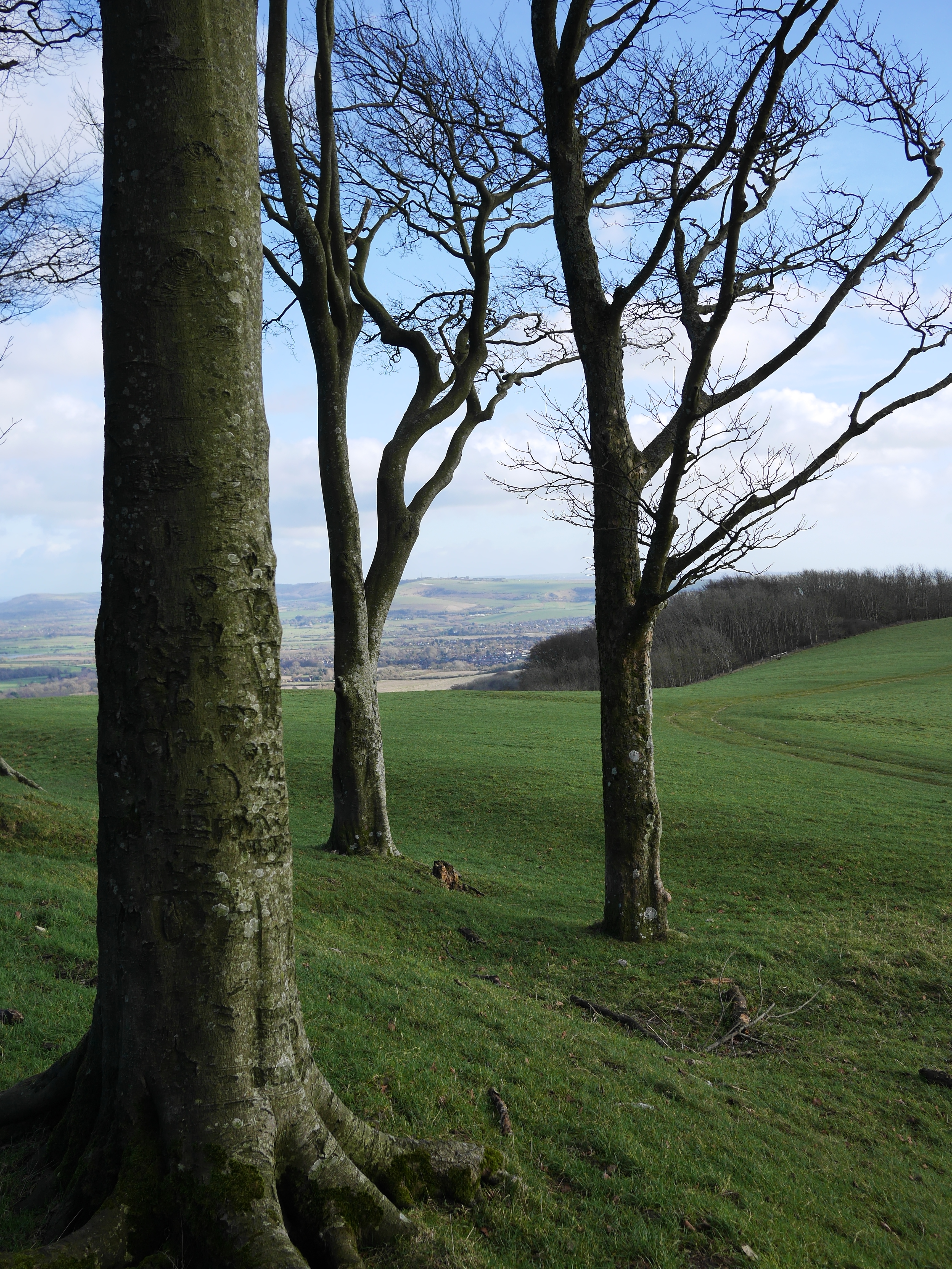 I love this place having spent nights camping here in its spooky earthworks. Its prominent setting and form is just so pleasing. As an important point in the SD ridgeway the ring ditch was built in either the Bronze and Iron ages perhaps for defence or to coralle livestock and later hosted Romano-British temples. There are many associated structures such as barrows in the area suggesting the site was of ritual significance. The outer ring was planted with Beech trees in the mid 18c and the interior planted in the early 20c which by the mid 20c further enhanced the amazingly distinctive living mound which could be seen from miles around. The storm of 1987 destroyed many of the trees leaving an unrecognisable mess. Since then the Ring has been replanted and the canopy is already beginning to resemble its former self. You can just see Steyning in the river Adur valley below, about four miles distant, from the E end of the Ring (pics below).