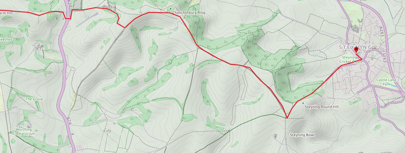 Leaving Chanctonbury Ring, the path is pleasant level, easy walking with great views, after a mile and a half there are options. Leave the SDW at the path signposted ‘Steyning 1.2m’ or continue on the SDW as it turns S then leave the SDW and double back NE towards the village (this option indicated on map). I took the former option and regretted it. This route follows the gnarly edge of the woodland hugging the scarp slope and the going was muddy, narrow and annoying. Better when dry I’m sure but not on a wet January afternoon. My route eventually joined the alternative route above the village. Then there is a steep descent into the streets leading to the centre of Steyning.