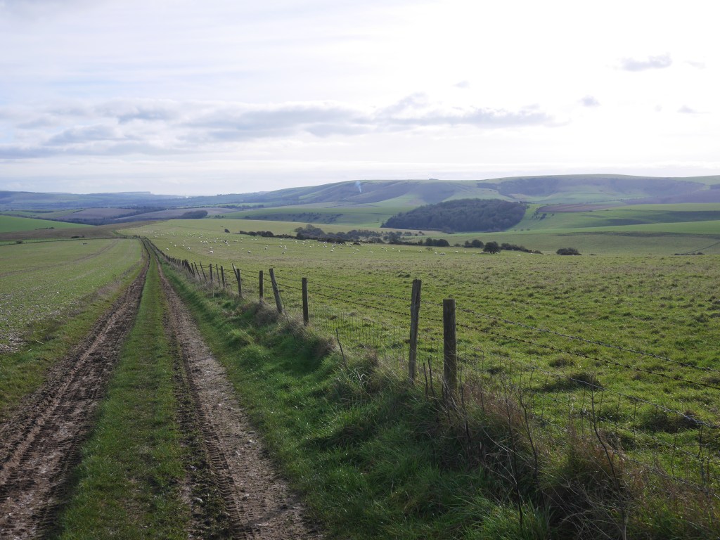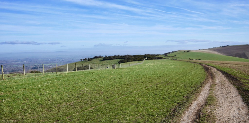 From Plumpton Plain views of the Ouse valley and coast, including the Seven Sisters cliffs, open up together with views of the Downs beyond the Ouse marching E towards Alfriston. The path soon turns right heading S away from the scarp slope into the rolling dip slope of the South Downs. The landscape becomes a patchwork of largely arable fields with some grazing and the path less busy as it heads away from the obvious route towards Lewes.