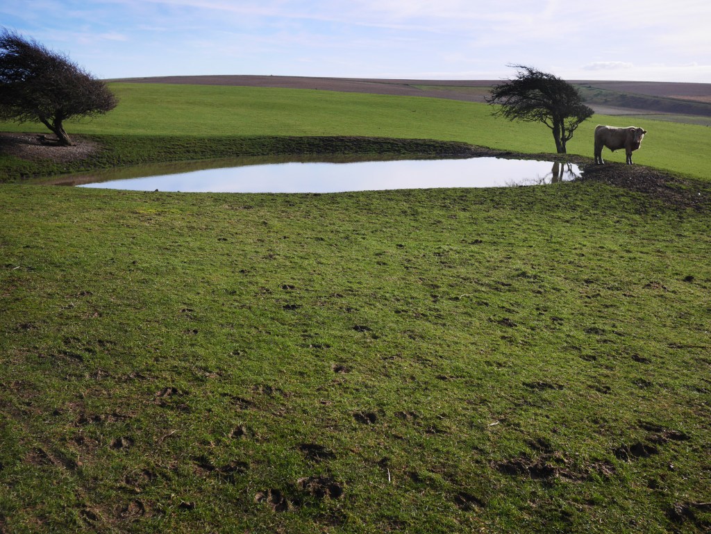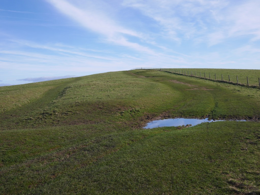 The path carries on roughly S before reaching the busy A27. There is free water by Housedean Farm (and a campsite) before the path crosses the bridge over the road then continues parallel to it, backtracking past a foot tunnel on the right before going under a second bridge/tunnel a few hundred yards further on. Thankfully once through this the sound of the road diminishes as you begin to climb past a stretch of wood to the left. The route emerges onto the edge of a large bowl, the edge of which you trace around – always climbing to nearly 600ft /190m. The views become expansive as you pass the Dew Pond at the top.