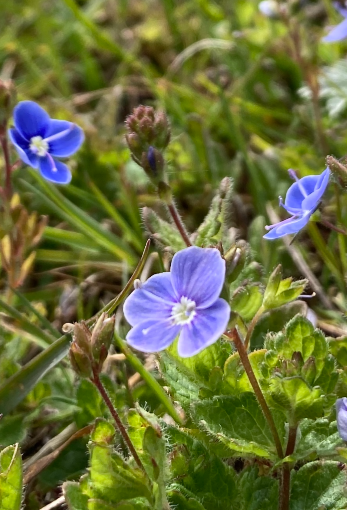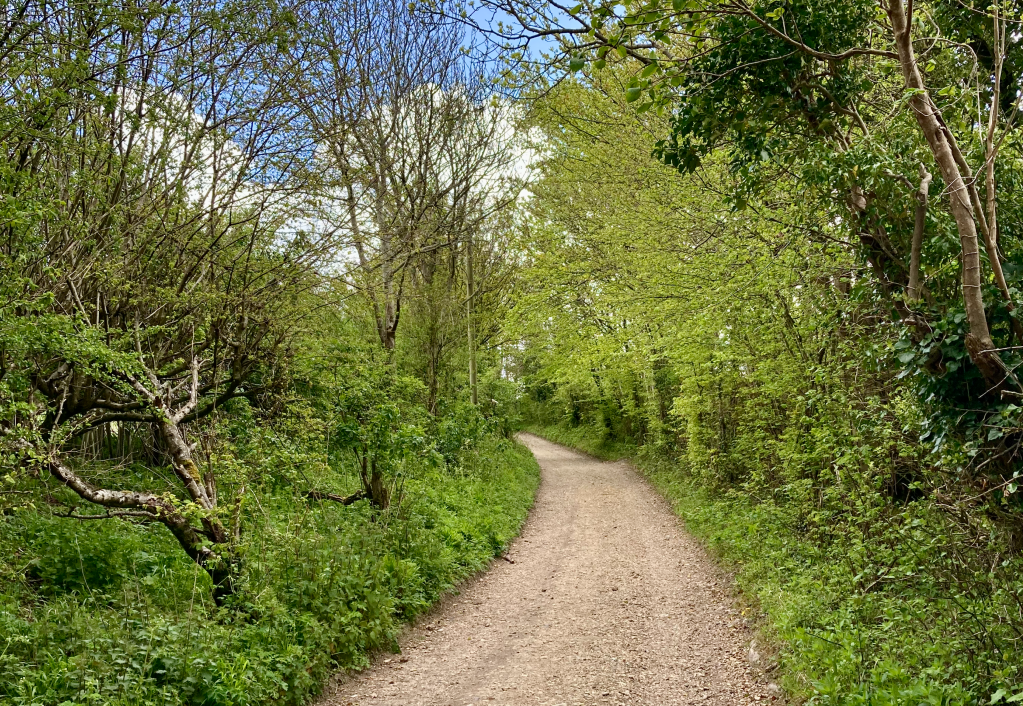 The route heads roughly E along a minor road before hitting a track, which in turn becomes another minor road. This mix of small road and track is repeated for nearly two miles through fields and a patch of woodland but is easy going and a chance to get into your stride with tantalising views through the hedges either side of Field Maple, Hazel and Traveller’s Joy to the Surrey Hills to the N and chalk tinted dry river valley fields stretching to the S. Wild flowers: Greater Stitchwort, Bluebell, Yellow Rattle, and many others are abundant.