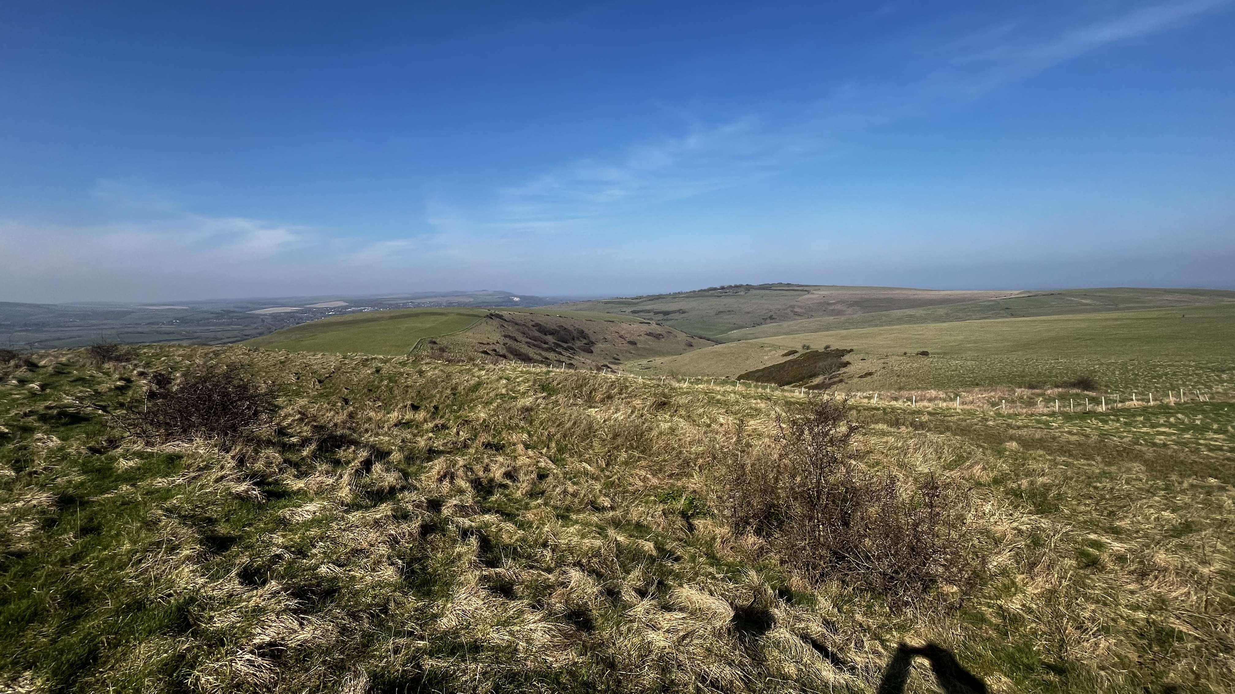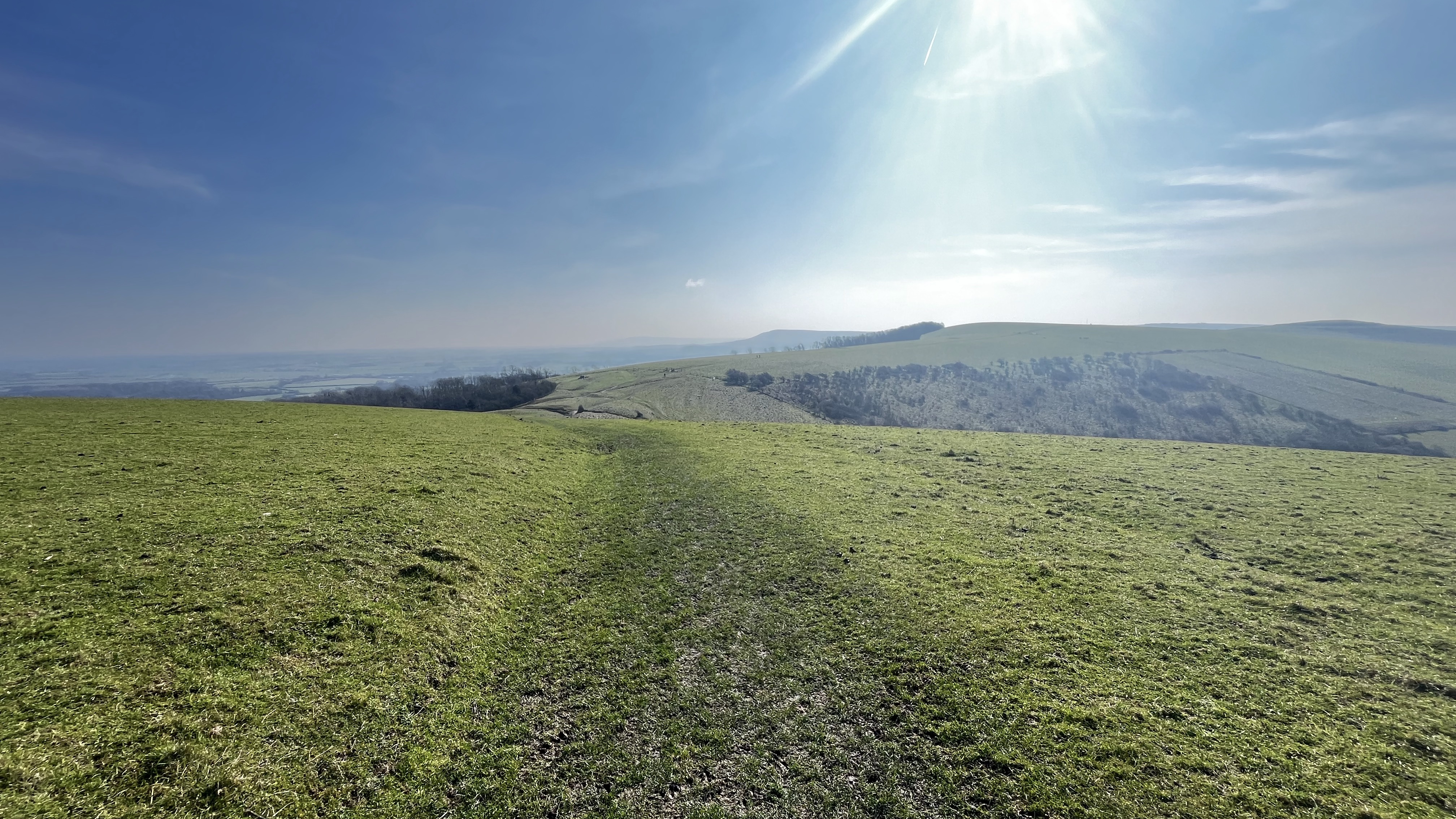 Continue across the course roughly east between the tees. The walk continues to climb and is signposted in places. The views begin to become wider until at the 1.4 mile mark you leave the golf course and the path becomes a little wilder and level. At 2.4 miles there is a stile (or gate, can’t remember), then head south east towards the 135m high point and tumuli. The path descends a little, crosses some deep tracks then climbs up to another and stile. Head roughly south along the fence line to the highpoint at 148m as ‘The Caburn’ begins to take shape – follow your nose.