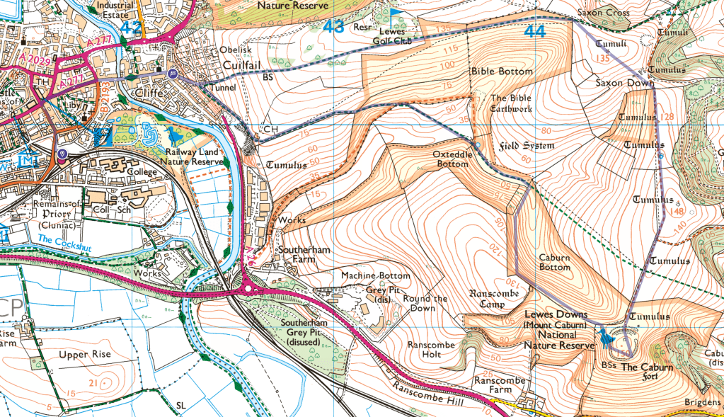 From the fort walk northwest towards the stile into the rough slope above Caburn Bottom, turn left and walk northwest keeping the fence line to your left (there is another stile into the field adjacent, ignore this) and follow the rough path as it tracks the dry valley below before veering to the right – northward and down to the bottom of the valley and a gate which takes you through the valley floor for a half mile or so heading northwest, past a dew pond and another gate before taking the path rising up the ridge flank to your right and heading west with great views of the valley until the path meets the top of Chapel lane by the golf course Clubhouse. Walk down the lane and you reach South Street at the 5 mile mark into town.